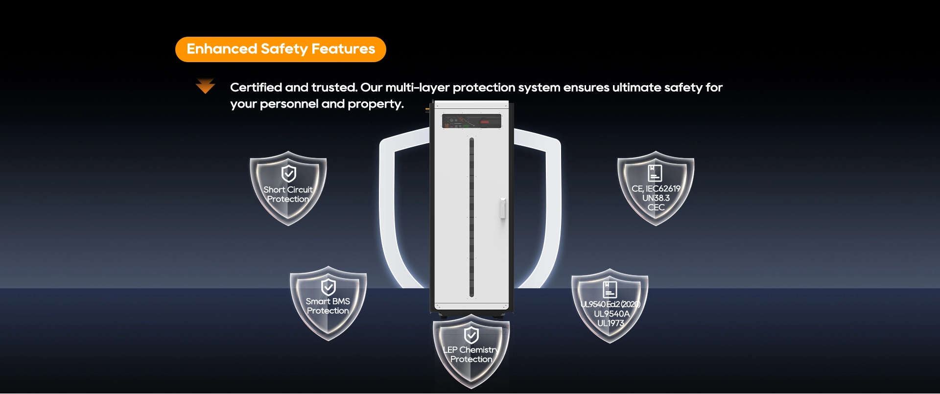 | CE, IEC62619, UL1973, UN38.3, (À déterminer : UL9540, UL9540A) |
