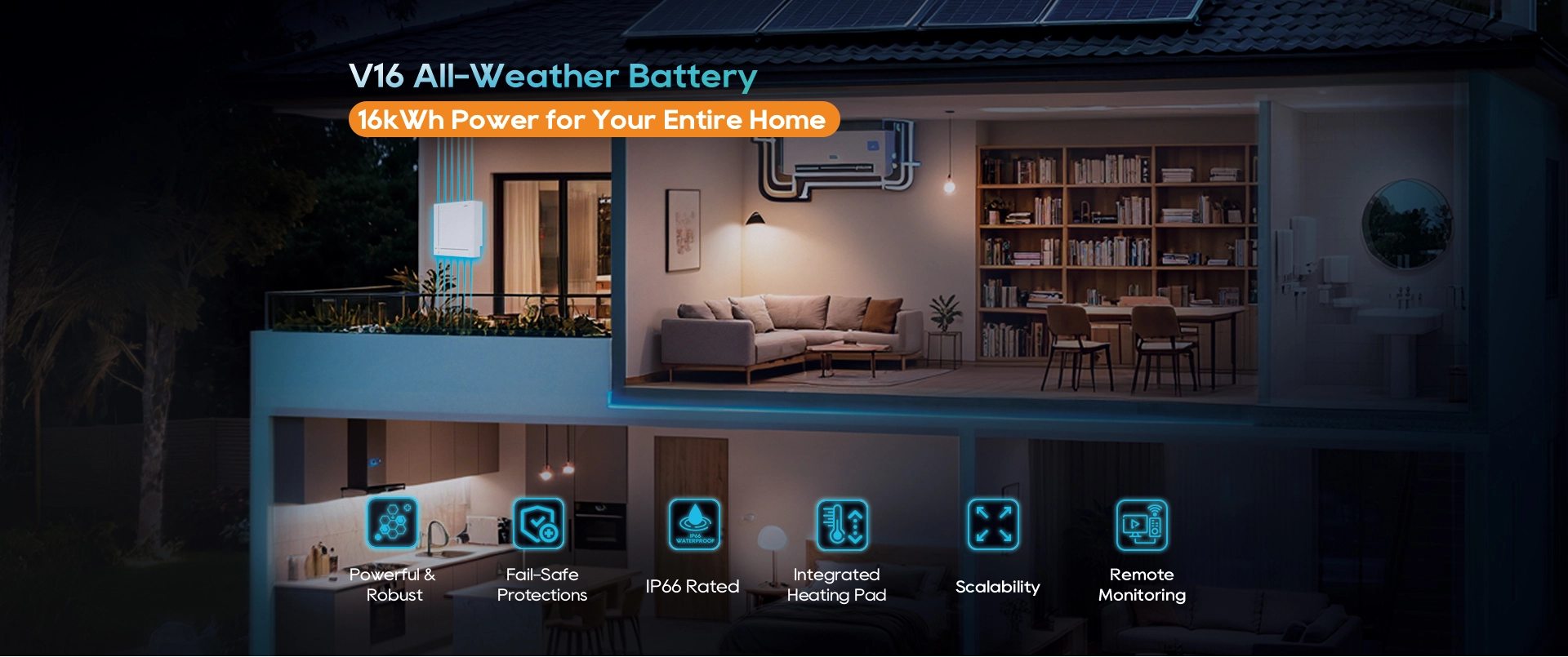 Une batterie murale haute performance conçue pour le stockage d'énergie par tous les temps. La V16 est une batterie de stockage d'énergie LFP de 51,2 V offrant une capacité de 16 kWh et une puissance de sortie maximale de 10,24 kW. Dotée d'un boîtier IP66, d'un système de chauffage intégré et d'une durée de vie de 8 000 cycles, elle garantit un fonctionnement fiable, sûr et stable pour les applications solaires résidentielles et commerciales de petite taille, ainsi que pour les systèmes de secours.