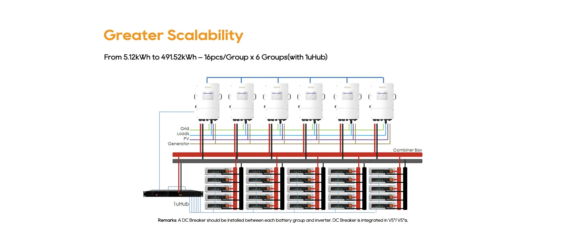 | Évolutivité | 16 unités (81,92 kWh) par groupe 6 groupes (491,52 kWh) dans un système avec hub |